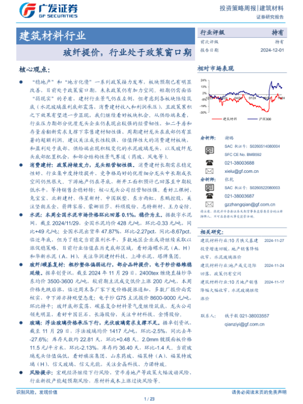 【广发证券】【20241201】建筑材料行业:玻纤提价,行业处于政策窗口期-23页 行业研究