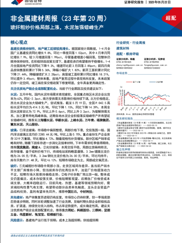 【国信证券】【20230522】非金属建材周报:玻纤粗纱价格局部上涨,水泥加强错峰生产-24页 行业研究