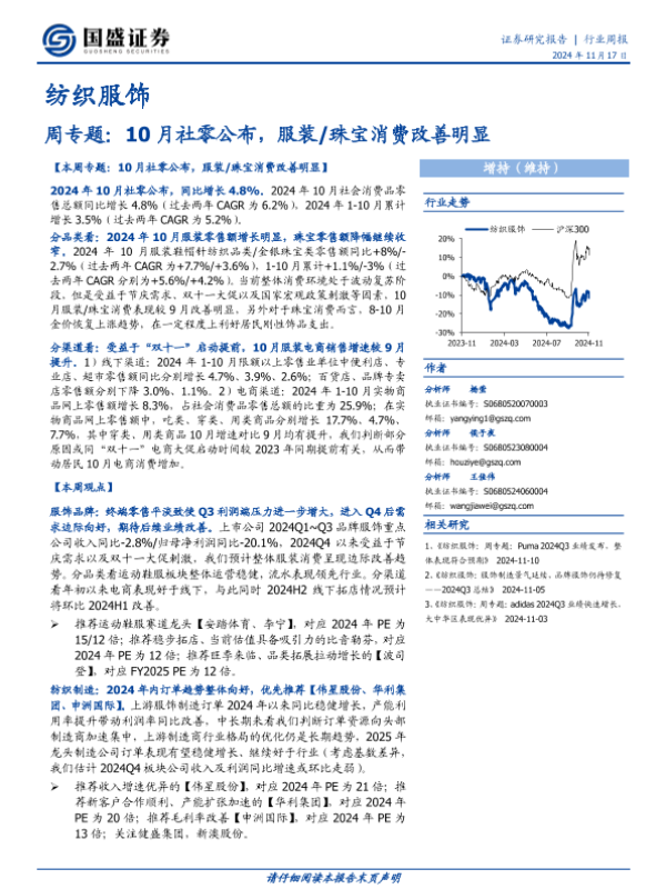 【国盛证券】【20241117】纺织服饰周专题:10月社零公布,服装 珠宝消费改善明显-15页 行业研究