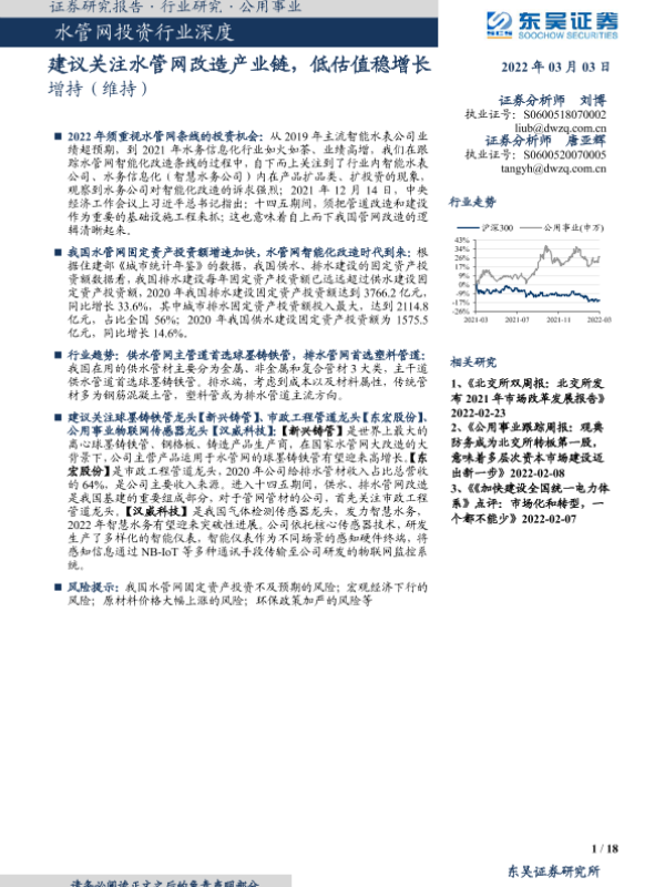 【东吴证券】【20220303】水管网投资行业深度:建议关注水管网改造产业链,低估值稳增长-18页 行业研究
