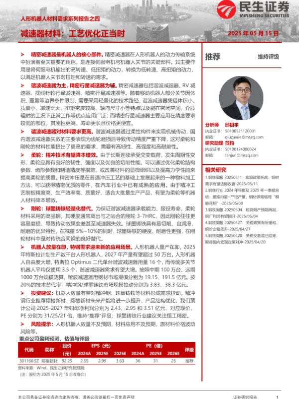 【民生证券】【20250515】钢铁行业人形机器人材料需求系列报告之四:减速器材料,工艺优化正当时-29页 证券期货研究报告