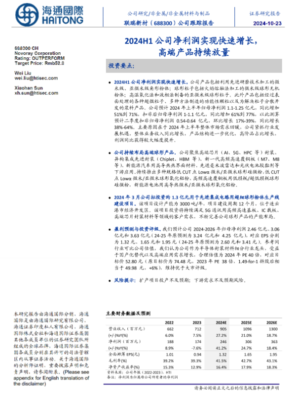 【海通国际】【20241023】联瑞新材(688300)公司跟踪报告:2024H1公司净利润实现快速增长,高端产品持续放量-11页 行业研究