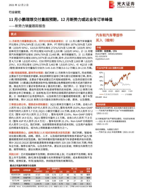 【光大证券】【20211202】汽车和汽车零部件行业研究:新势力销量跟踪报告:11月小鹏理想交付量超预期,12月新势力或达全年订单峰值-3页 行业研究