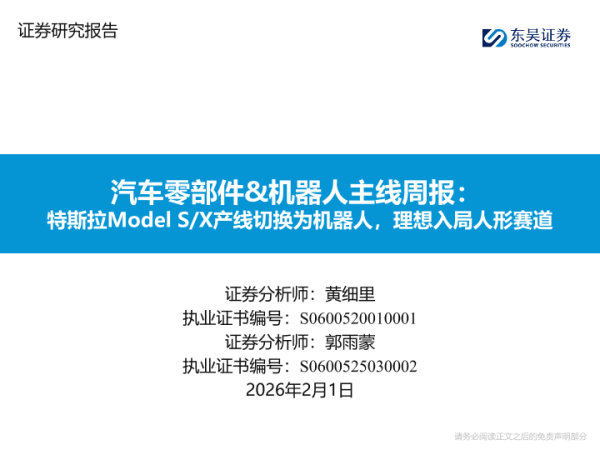 【东吴证券】【202602】汽车零部件&机器人主线周报:特斯拉Model S/X产线切换为机器人,理想入局人形赛道-23页 证券期货研究报告