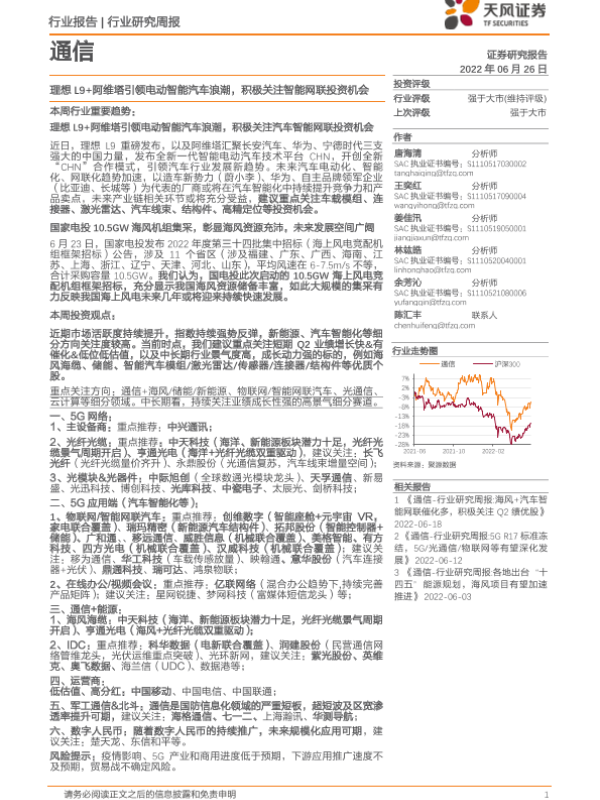 【天风证券】【20220626】通信行业研究周报:理想L9+阿维塔引领电动智能汽车浪潮,积极关注智能网联投资机会-12页 行业研究