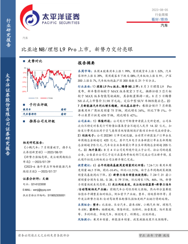 【太平洋证券】【20230805】20230806-太平洋-汽车行业周报:比亚迪N8 理想L9 Pro上市,新势力交付亮眼-19页 行业研究