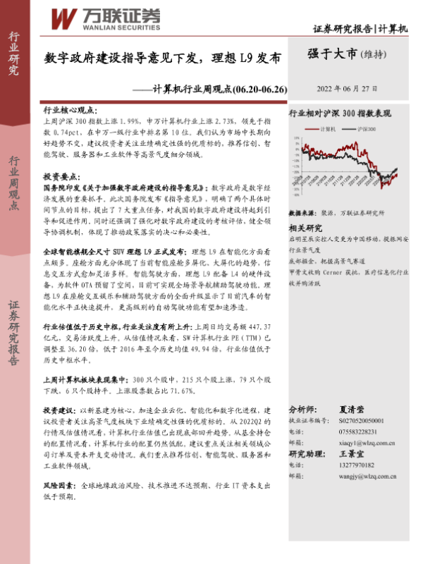 【万联证券】【20220627】20220627-万联证券-计算机行业周观点:数字政府建设指导意见下发,理想L9发布-12页 行业研究