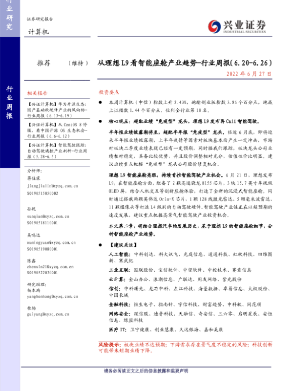 【兴业证券】【20220627】从理想 L9看智能座舱产业趋势-行业周报(6.20-6.26)-28页 行业研究