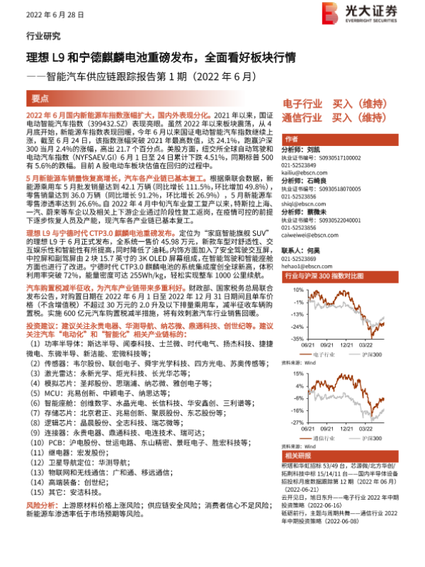 【光大证券】【20220628】智能汽车供应链跟踪报告第1期(2022年6月):理想L9和宁德麒麟电池重磅发布,全面看好板块行情-14页 行业研究