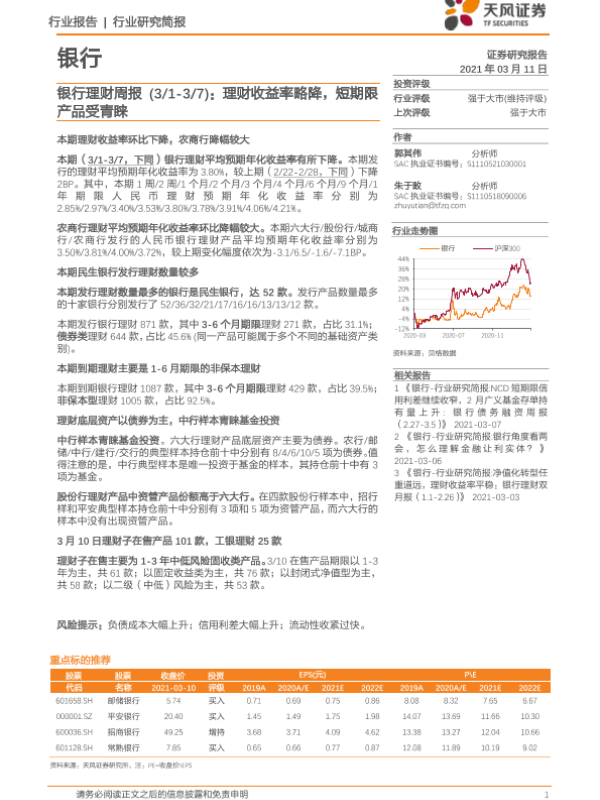 【天风证券】【20210311】理财收益率略降,短期限产品受青睐-17页 行业研究