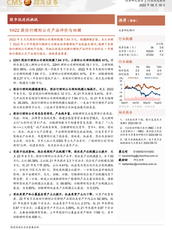 【海通证券】【20220918】银行业1H22股份行理财公司产品评价与回顾:股市低迷的挑战-22页 行业研究