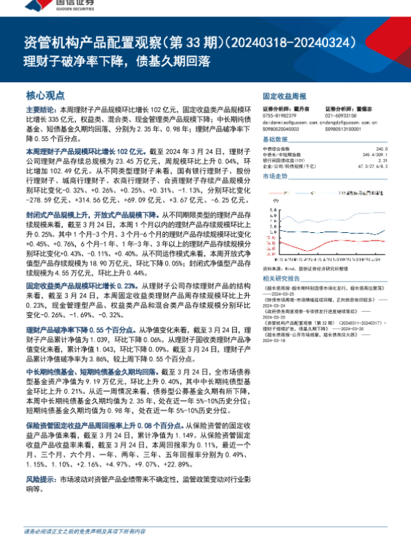 【国信证券】【20240327】资管机构产品配置观察(第33期):理财子破净率下降,债基久期回落-14页 行业研究