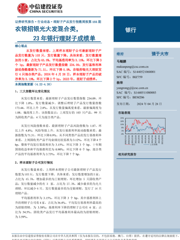 【中信建投证券】【20240428】银行业理财子产品发行指数周报第155期:农银招银光大发混合类,23年银行理财子成绩单-21页 行业研究