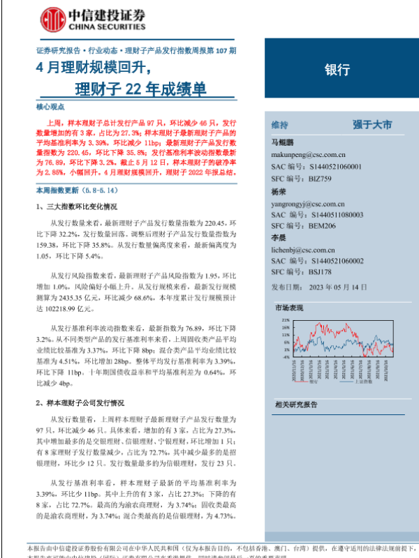 【中信建投证券】【20230514】银行业理财子产品发行指数周报第107期:4月理财规模回升,理财子22年成绩单-23页 行业研究