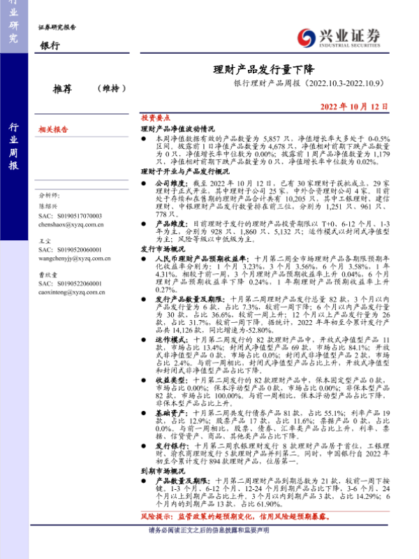 【兴业证券】【20221012】银行理财产品周报:理财产品发行量下降-19页 行业研究