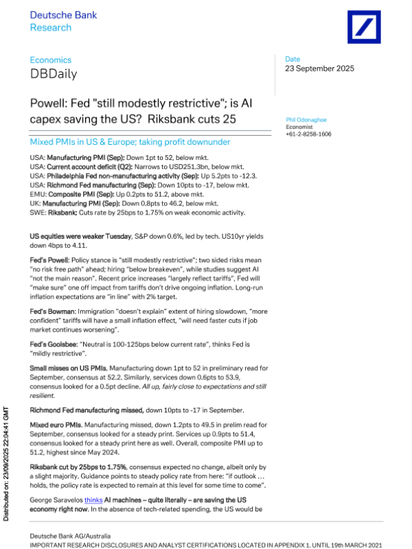 【Deutsche Bank AG/Australia】【202509】Powell Fed"still modestly restrictive"; is AI capex saving the US? Riksbank cuts 25-13页 证券期货研究报告