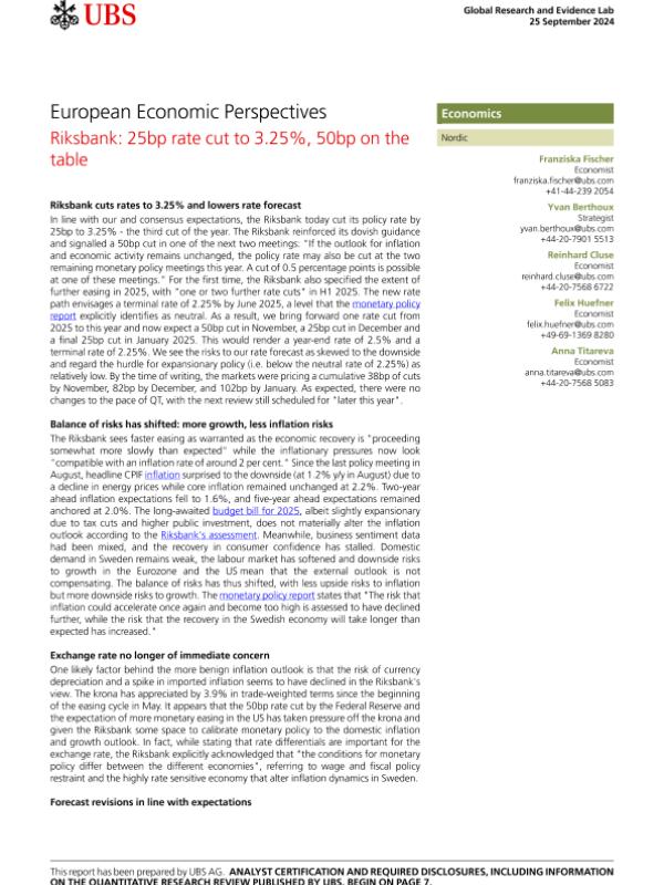 【UBS AG】【20240925】European Economic Perspectives _Riksbank 25bp rate cut to 3.25%-10页 宏观策略