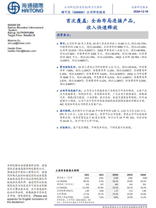 【海通国际】【20241216】瑞可达(688800)首次覆盖:全面布局连接产品,收入快速释放-12页 行业研究