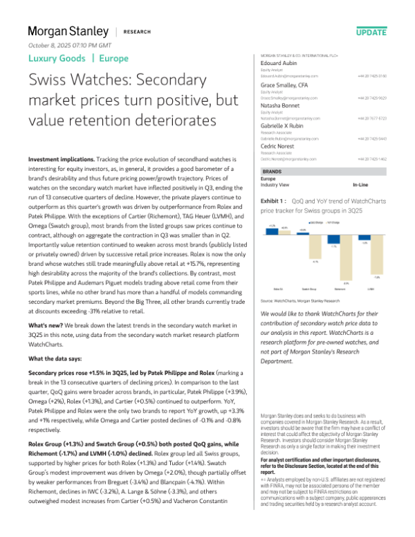 【Morgan Stanley】【202510】Luxury Goods|Europe Swiss Watches Secondary market prices turn positive, but value retention deteriorates-50页 证券期货研究报告