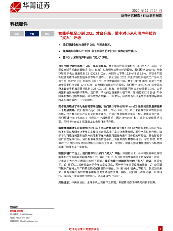 【华兴证券(境内)】【20201214】科技硬件行业更新报告:智能手机至少到2021才会升级,重申对小米和瑞声科技的“买入”评级-25页 行业研究