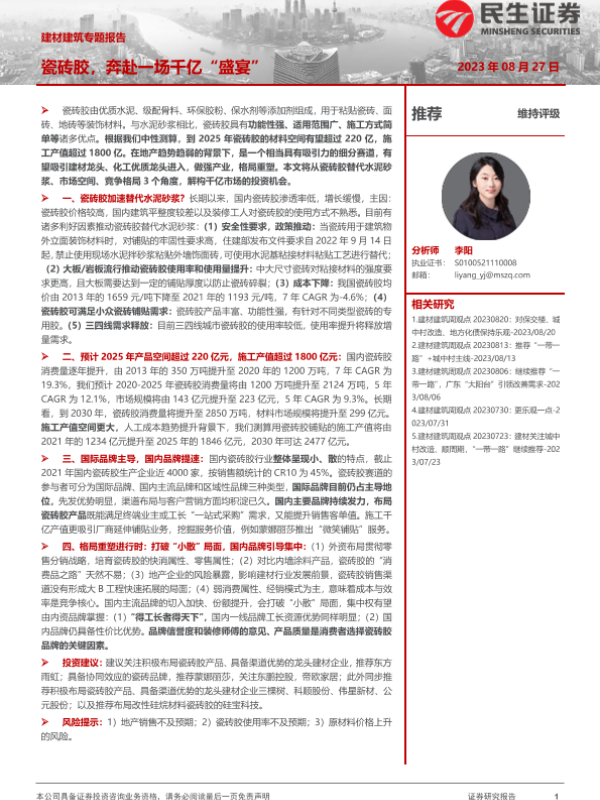 【民生证券】【20230827】建材建筑行业专题报告:瓷砖胶,奔赴一场千亿“盛宴”-20页 行业研究