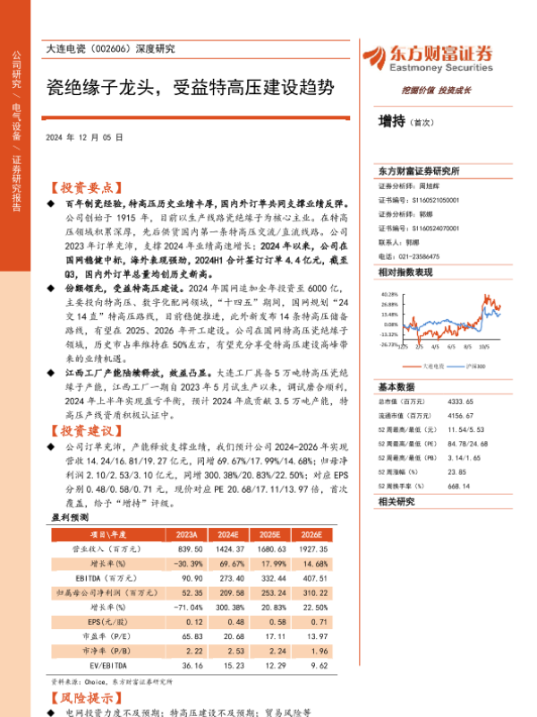 【东方财富证券】【20241205】大连电瓷(002606)深度研究:瓷绝缘子龙头,受益特高压建设趋势-22页 行业研究