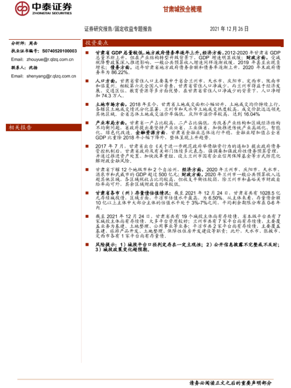 【中泰证券】【20211226】固定收益专题报告:甘肃城投全梳理-25页 行业研究