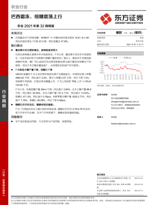 【东方证券】【20210731】农业2021年第32周周报:巴西霜冻,纽糖震荡上行-9页 行业研究