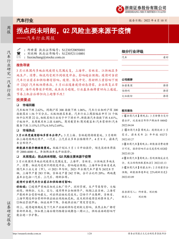 【浙商证券】【20220410】20220410-浙商证券-汽车行业周报:拐点尚未明朗,Q2风险主要来源于疫情-24页 行业研究
