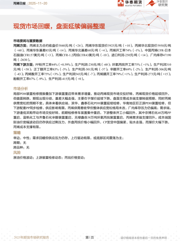 【华泰期货】【202511】丙烯日报_现货市场回暖_盘面延续偏弱整理-10页 证券期货研究报告