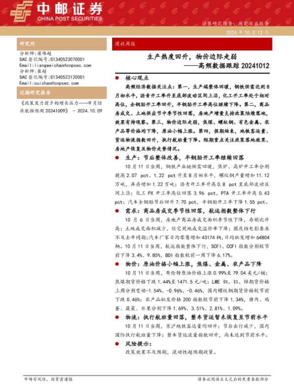 【中邮证券】【20241012】高频数据跟踪:生产热度回升,物价边际走弱-13页 行业研究
