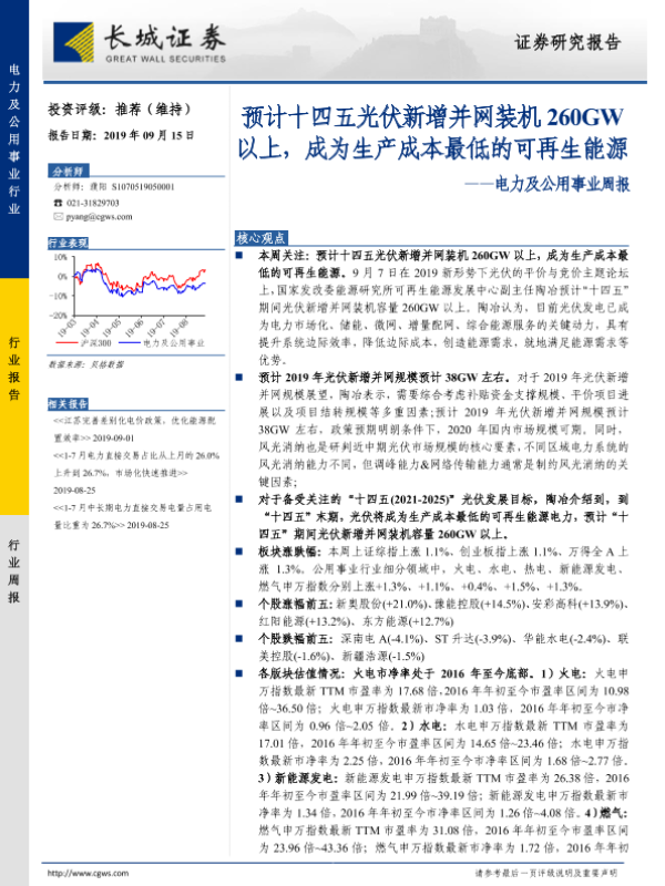 【长城证券】【20190915】预计十四五光伏新增并网装机260GW以上,成为生产成本最低的可再生能源-12页 行业研究