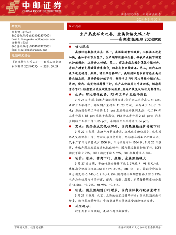 【中邮证券】【20240930】高频数据跟踪:生产热度环比改善,金属价格大幅上行-13页 行业研究