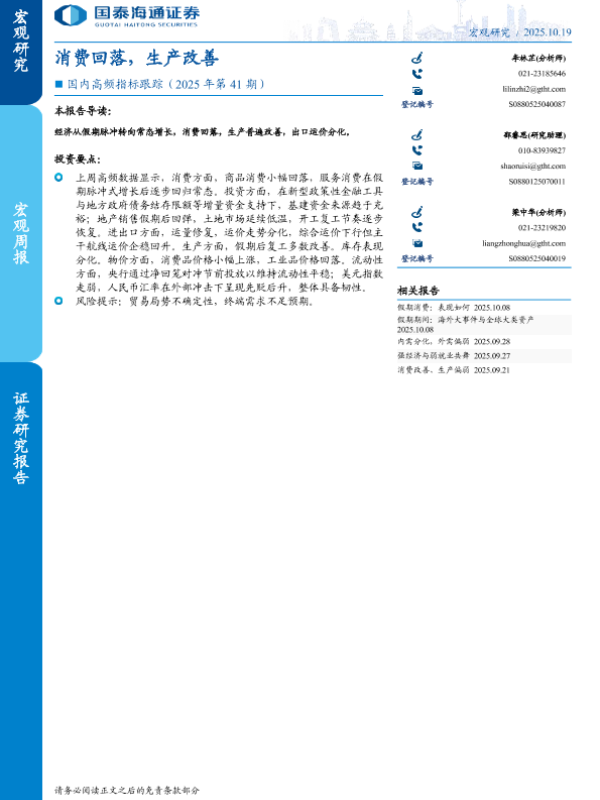 【国泰海通证券】【202510】消费回落,生产改善-10页 证券期货研究报告