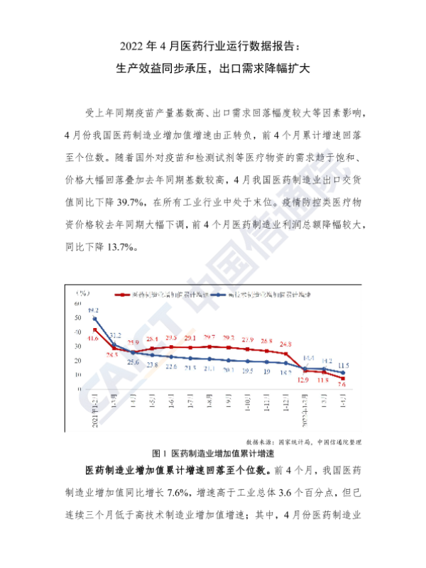 【中国信通院】【20220701】2022年5月医药行业运行数据报告:生产效益同步承压,出口降幅有所收窄-3页 行业研究