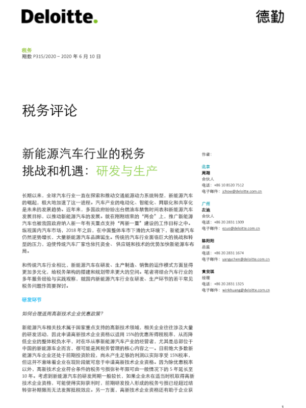 【德勤】【20200610】新能源汽车行业的税务:挑战和机遇:研发与生产-6页 行业研究