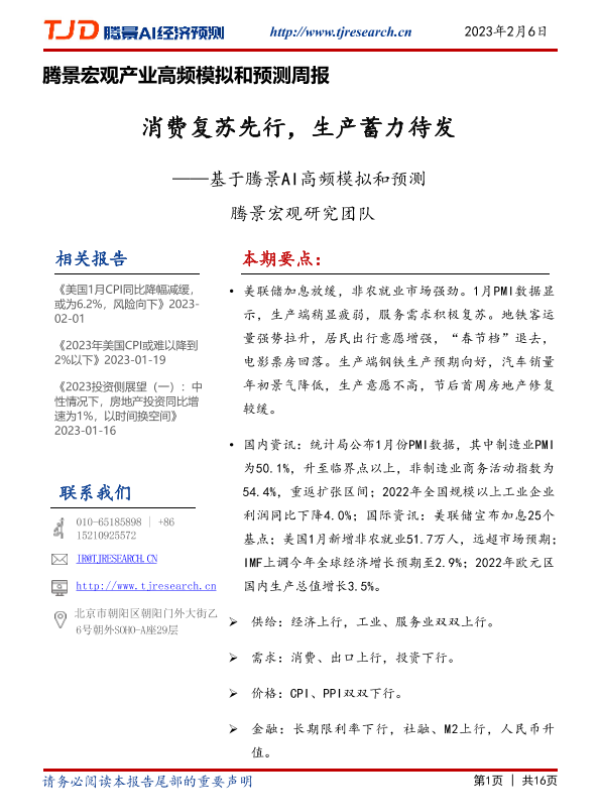 【腾景AI】【20230206】宏观周报:消费复苏先行,生产蓄力待发-16页 行业研究