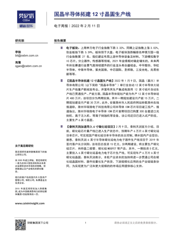 【莫尼塔研究】【20220211】电子周报:国晶半导体拓建12寸晶圆生产线-6页 行业研究