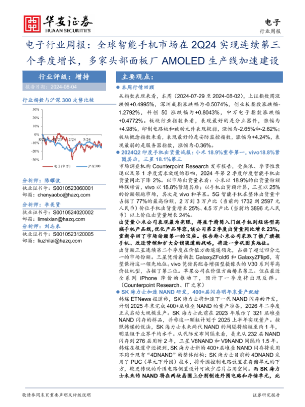 【华安证券】【20240804】20240804-华安证券-电子行业周报:全球智能手机市场在2Q24实现连续第三个季度增长,多家头部面板厂AMOLED生产线加速建设-28页 行业研究