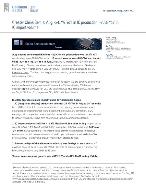 【Goldman Sachs】【20220916】Greater China Semis Aug -24.7% YoY in IC import volume-10页 行业研究