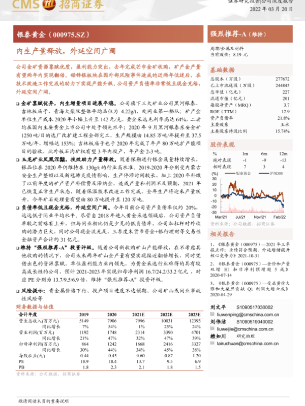 【海通证券】【20220320】银泰黄金-000975.SZ-内生产量释放,外延空间广阔-17页 证券期货研究报告