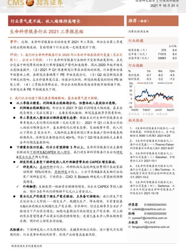 【海通证券】【20211031】生命科学服务行业2021三季报总结:行业景气度不减、收入端维持高增长-4页 证券期货研究报告
