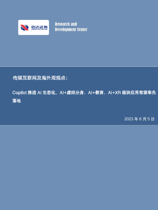【信达证券】【20230605】Copilot推进AI生态化,AI+虚拟分身、AI+教育、AI+XR板块应用有望率先落地-26页 行业研究