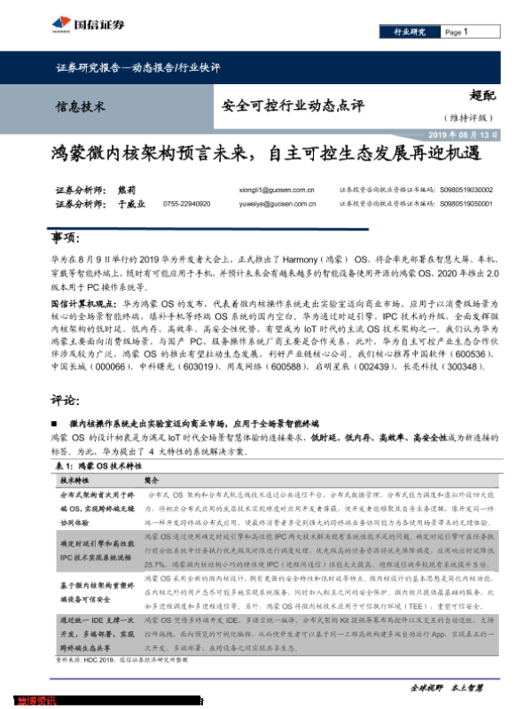 【国信证券】【20190813】安全可控行业动态点评:鸿蒙微内核架构预言未来,自主可控生态发展再迎机遇-6页 行业研究