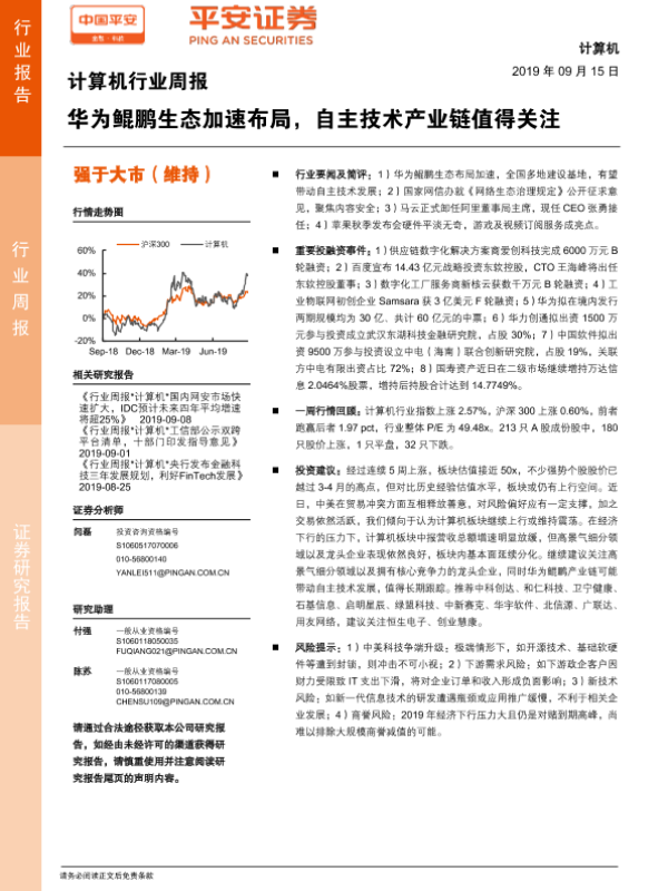 【平安证券】【20190915】计算机行业周报:华为鲲鹏生态加速布局,自主技术产业链值得关注-5页 行业研究