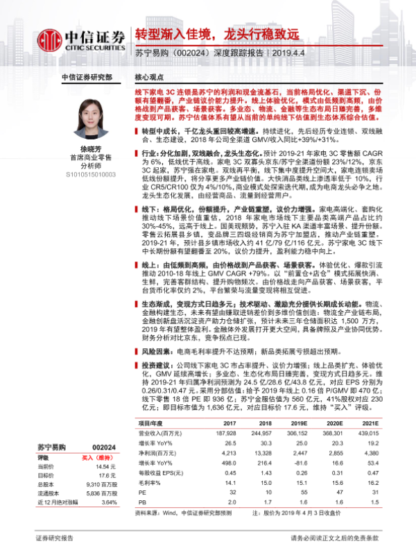 【中信证券】【20190404】20190404-中信证券-苏宁易购-002024.SZ-深度跟踪报告:转型渐入佳境,龙头行稳致远-48页 行业研究