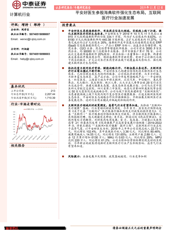 【中泰证券】【20191112】计算机行业专题研究报告:平安好医生参股海典软件强化生态布局,互联网医疗行业加速发展-2页 行业研究