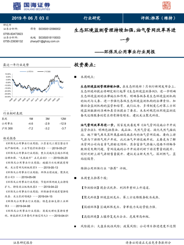 【国海证券】【20190603】环保及公用事业行业周报:生态环境监测管理持续加强,油气管网改革再进一步-10页 行业研究