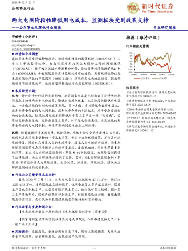 【新时代证券】【20200223】公用事业及环保行业周报:两大电网阶段性降低用电成本,监测板块受到政策支持-14页 行业研究