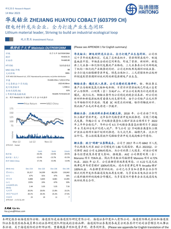 【海通国际】【20230314】华友钴业(603799)锂电材料龙头企业,全力打造产业生态闭环-26页 行业研究